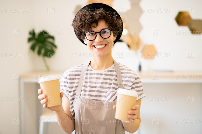 Счастливая леди-бариста с одноразовыми чашками для кофе