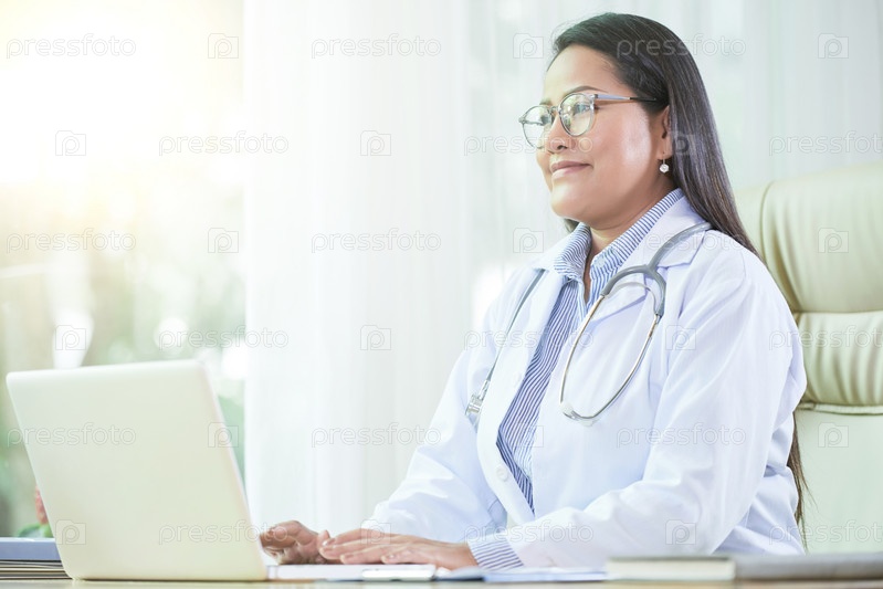 Улыбающаяся взрослая женщина работает в больничном кабинете