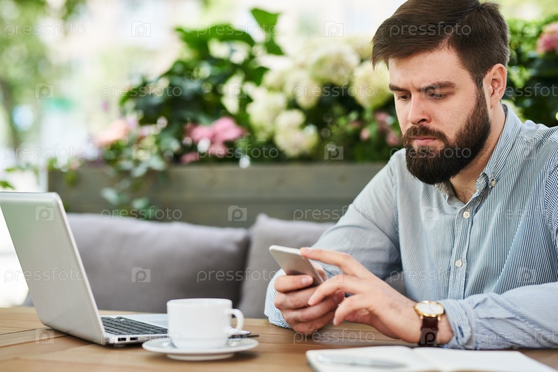 Бородатый бизнесмен использует смартфон в кафе