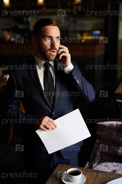Обеспокоенный бизнесмен разговаривает по телефону в ресторане