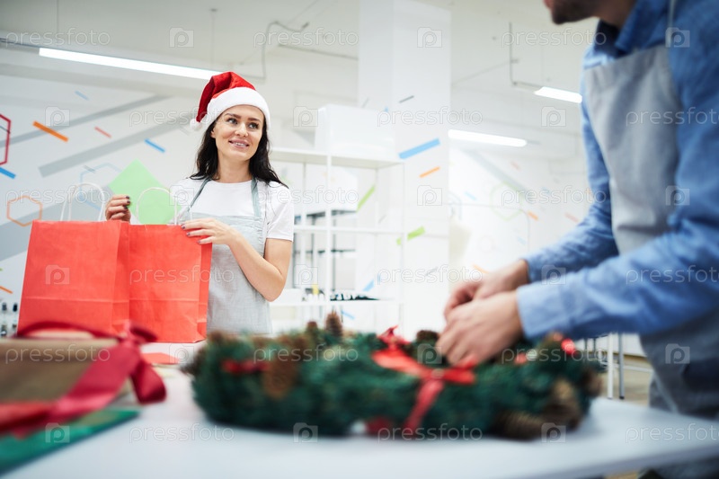 Позитивные дизайнеры работают над рождественскими украшениями в студии