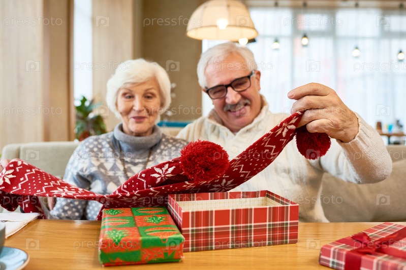 Веселые бабушки и дедушки открывают рождественские подарки за столом