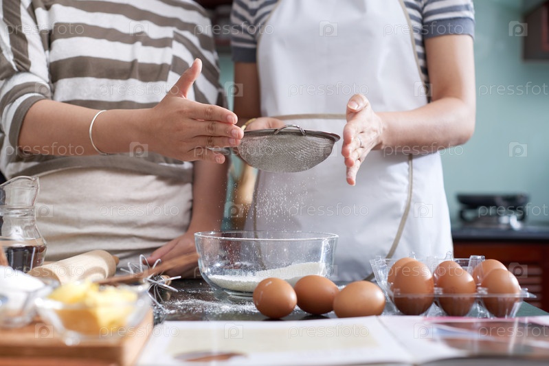 Женщина-кухарка просеивает муку