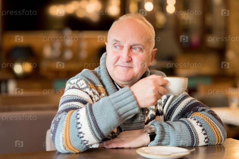 Толстый мужчина в свитере сидит в кафе