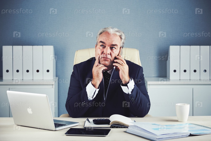 Задумчивый пожилой бизнесмен, разговаривающий со смартфоном