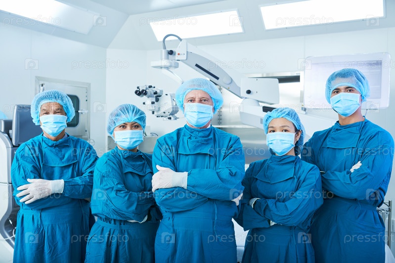 Уверенные в себе азиатские хирурги смотрят на камеру