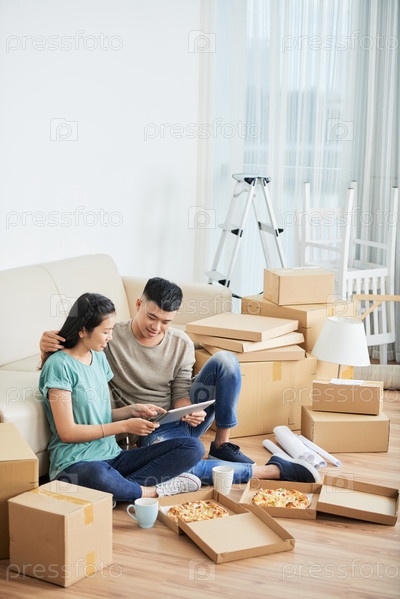 Пара, расслабляющаяся с планшетом в день переезда