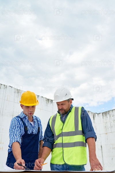 Два строителя смотрят на чертежи этажей на площадке