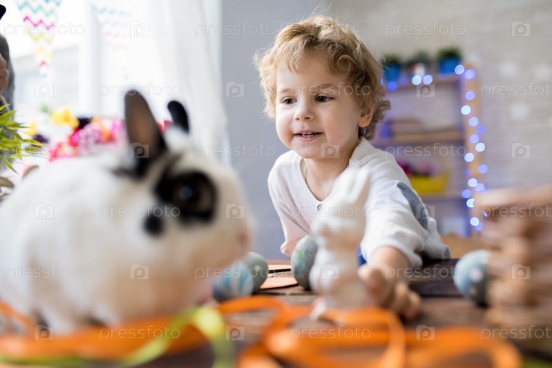 Маленький мальчик играет с домашним кроликом