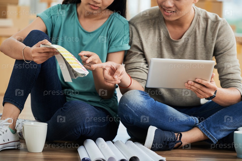 Анонимная пара с планшетом выбирает цвет для новой квартиры