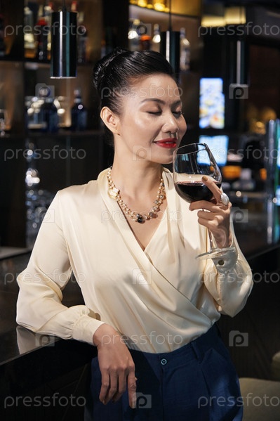 Деловая женщина с вином, опираясь на барную стойку