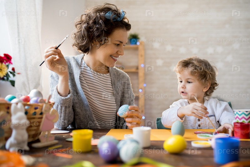 Маленький мальчик рисует пасхальные яйца
