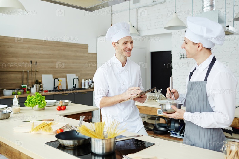 Счастливый повар разговаривает со стажером на уроке кулинарии