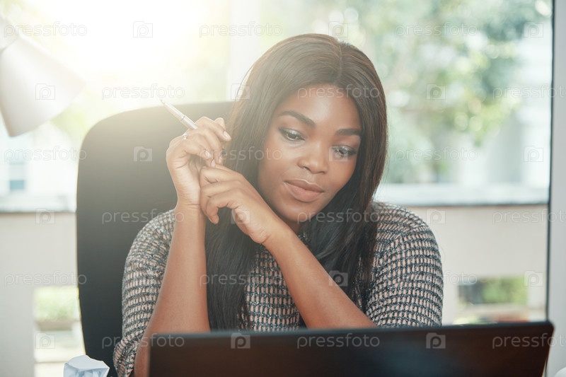 Красивая бизнесвуменка смотрит на ноутбук под солнцем