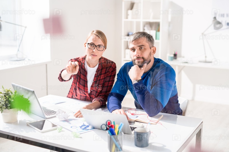 Вдумчивая леди объясняет план коллеге в офисе