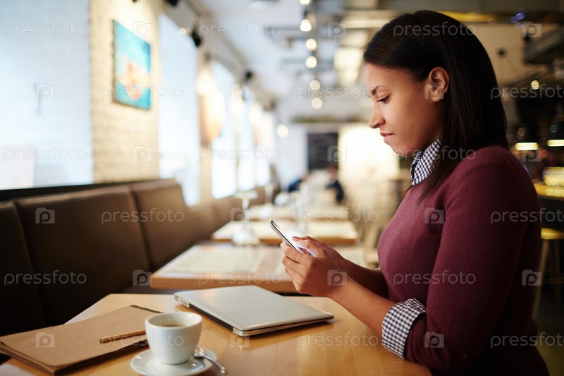 Женщина, использующая смартфон в кафе