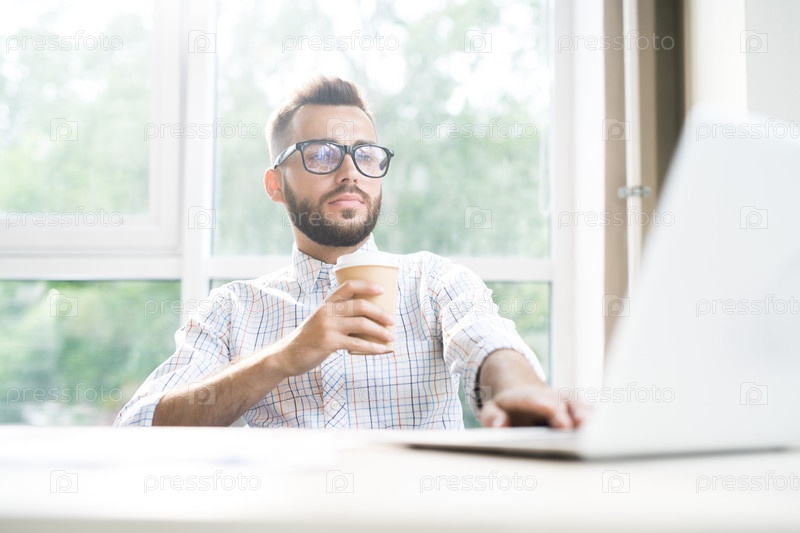 Успешный предприниматель пьет кофе в офисе