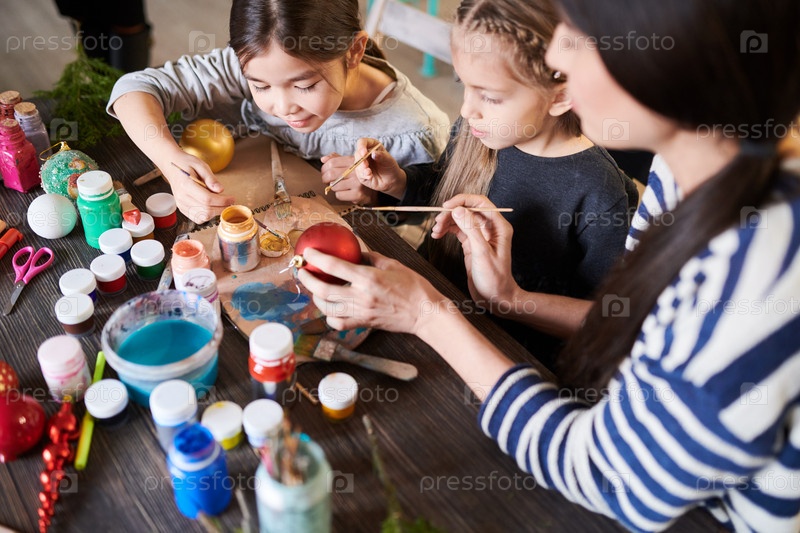 Девочки, рисующие рождественские украшения