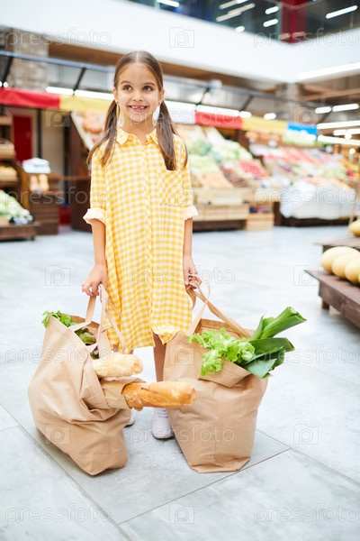 Улыбающаяся девочка с двумя большими мешками, полными еды