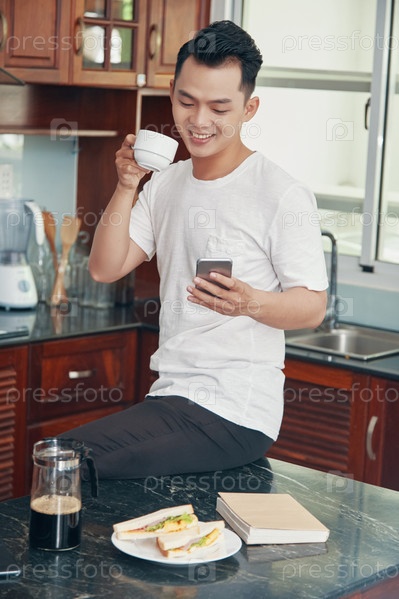 Расслабленный азиатский мужчина пользуется телефоном по утрам