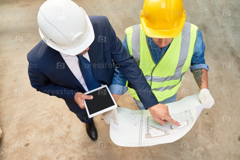 Строительная команда рассматривает чертежи этажей
