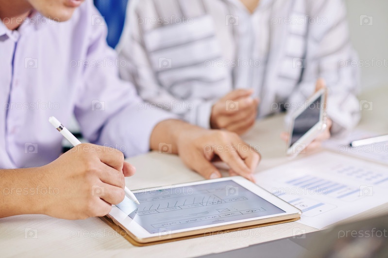 Коллеги с планшетом за столом в офисе