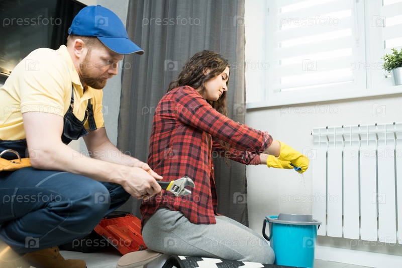 Леди сжимает ткань во время чистки пола от воды из радиатора
