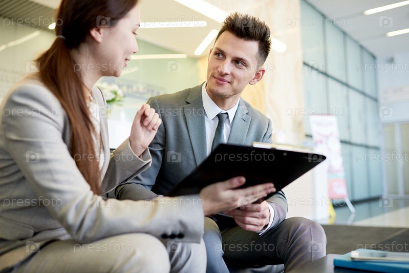 Веселые молодые коллеги обсуждают бизнес-проект