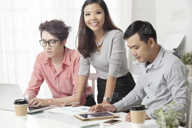 Улыбающаяся женщина с коллегами-мужчинами в офисе