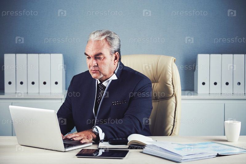 Старший бизнесмен, работающий на ноутбуке в офисе