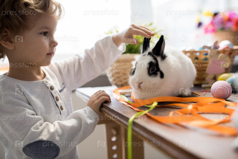 Милый мальчик играет с кроликом