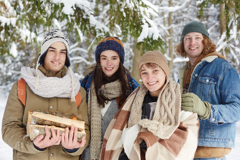 Группа молодых людей в Зимнем лесу