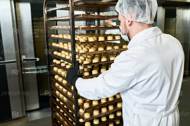 Работник фабрики кондитерских изделий толкает подносы стойку с выпечкой
