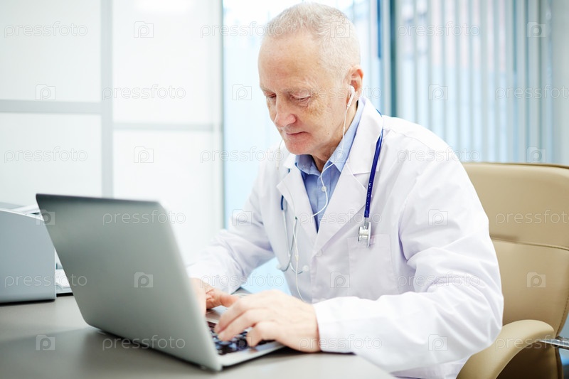 Загруженный врач, делающий отчет на ноутбуке