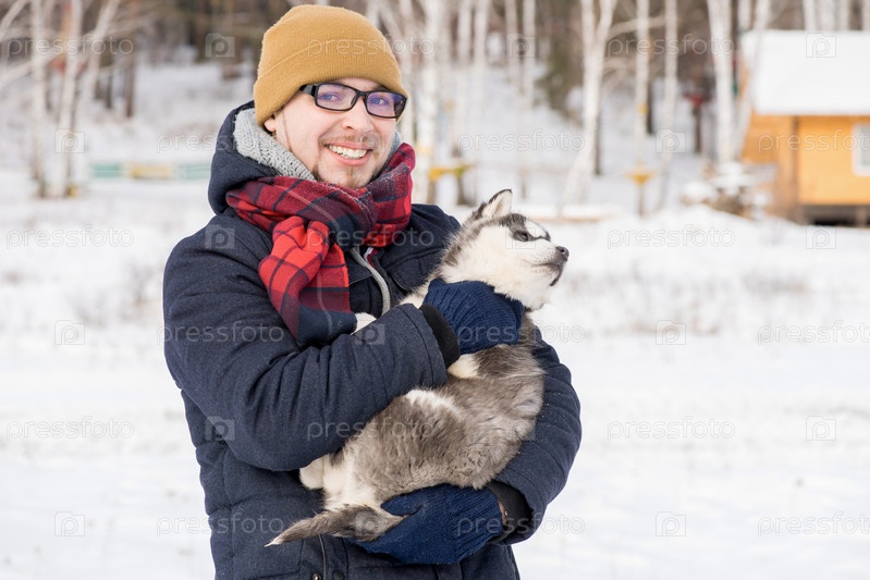 Молодой человек позирует с щенком зимой