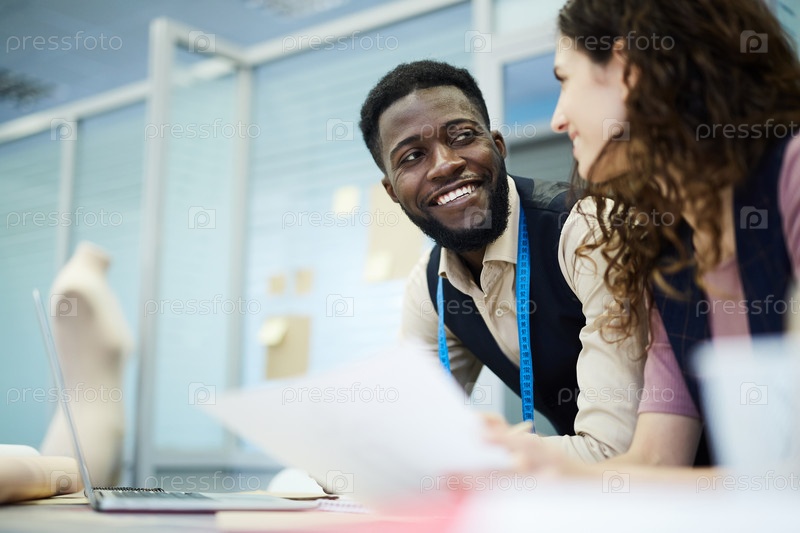 Положительные мультиэтнические портные, работающие вместе в студии