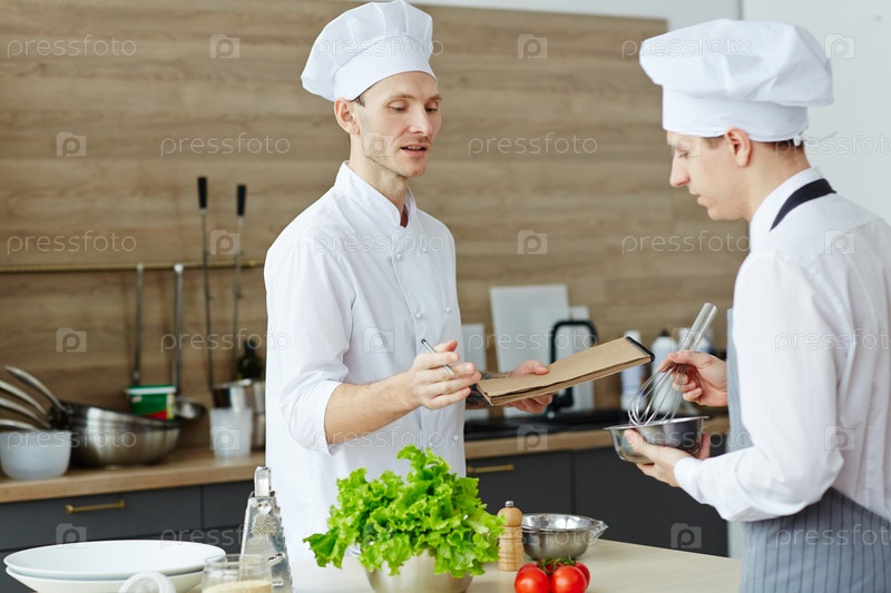Опытный шеф-повар преподает стажёр в классе кулинарии