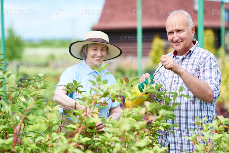 Пара пожилых людей в саду