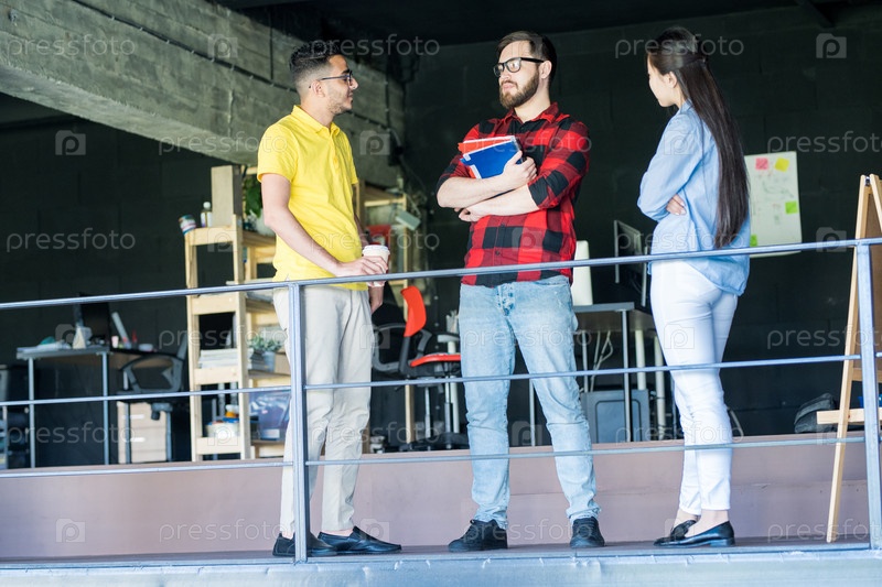 Команда творческих молодых людей, разговаривающих в офисе
