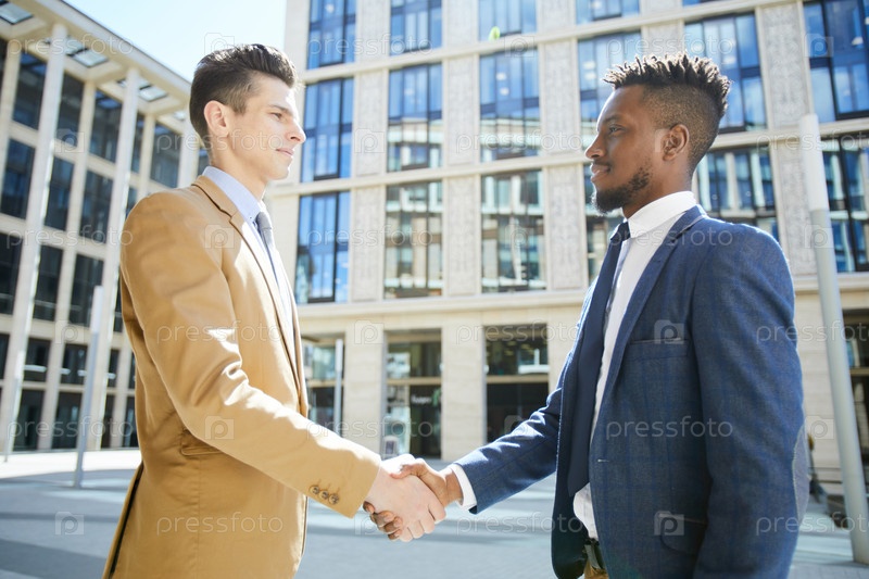 Бизнес-партнеры, обнимающиеся в финансовом районе
