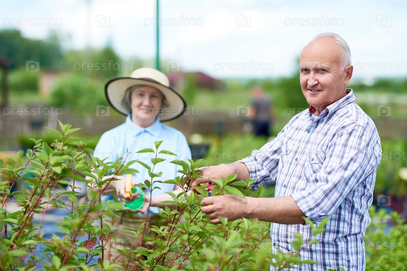 Пара счастливых старших фермеров в саду