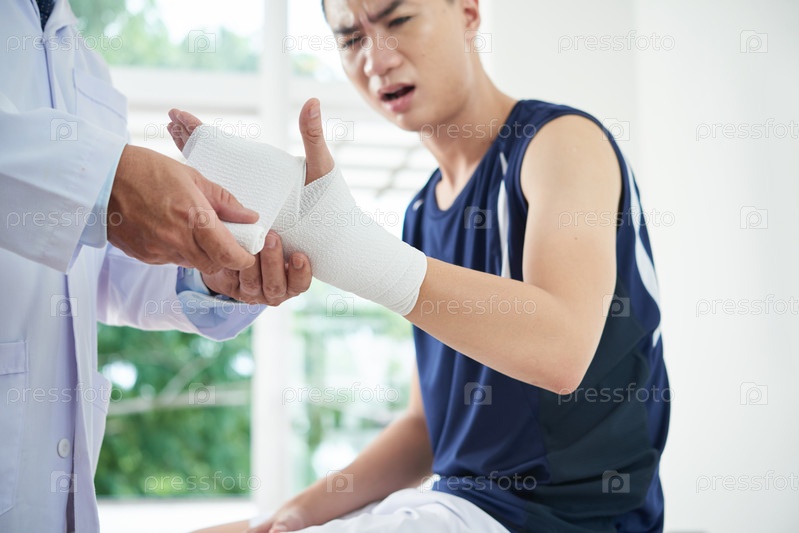 Урожайный врач повязывает руку азиатского мужчины