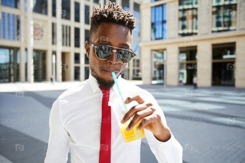 Красивый бизнесмен пьет смузи
