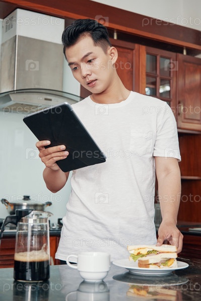 Этнический мужчина использует планшет и ест завтрак
