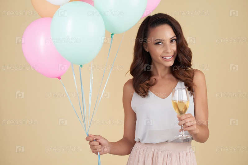 Позитивная очаровательная девочка с днем рождения пьет белое вино