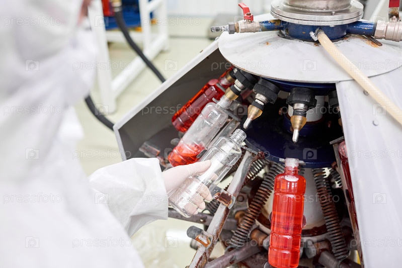 Фабричный работник помещает пустую бутылку в заполнительную машину