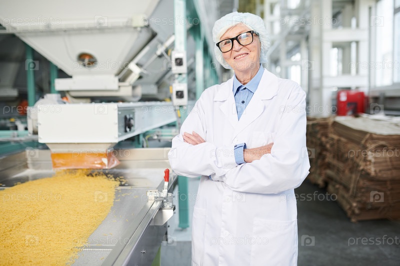 Старшая женщина позирует на фабрике Happy