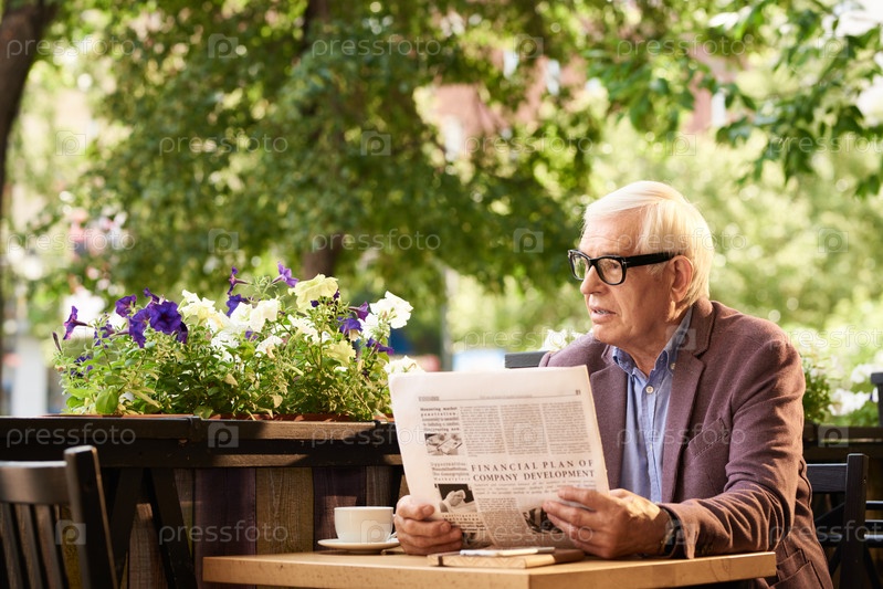 Старший мужчина читает газету в современном кафе на открытом воздухе