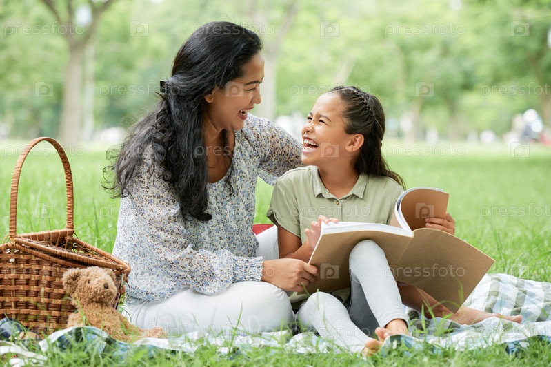 Веселая мать и дочь с книгой в парке