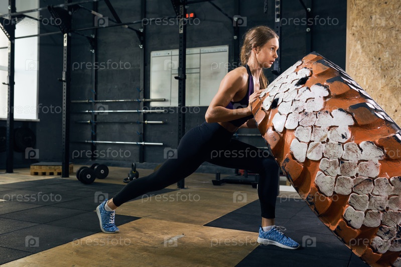 Красивая женщина, переворачивающая тракторную шину